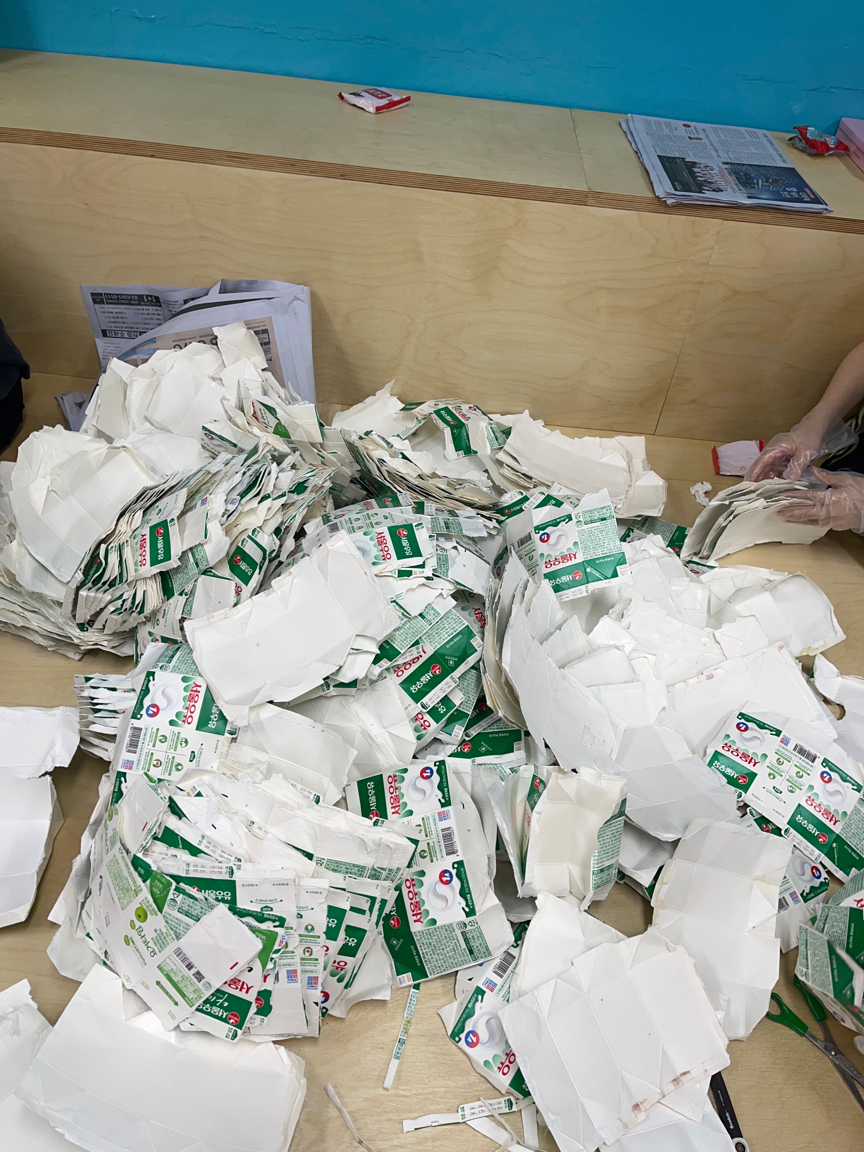 4. 우유팩 수거함에 차곡차곡 모읍니다. 각 반의 담당 학생이 위의 절차에 따라 행한 후 가져다 놓습니다.