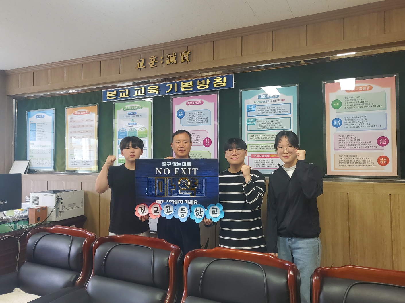 진교고등학교 교장(최달수)은 6월 22일 마약중독의 위험성을 알리고 마약 관련 범죄 예방을 위한 `노 엑시트(No Exit) 릴레이 캠페인‘에 학교장과 학생회 임원들이 동참했다.