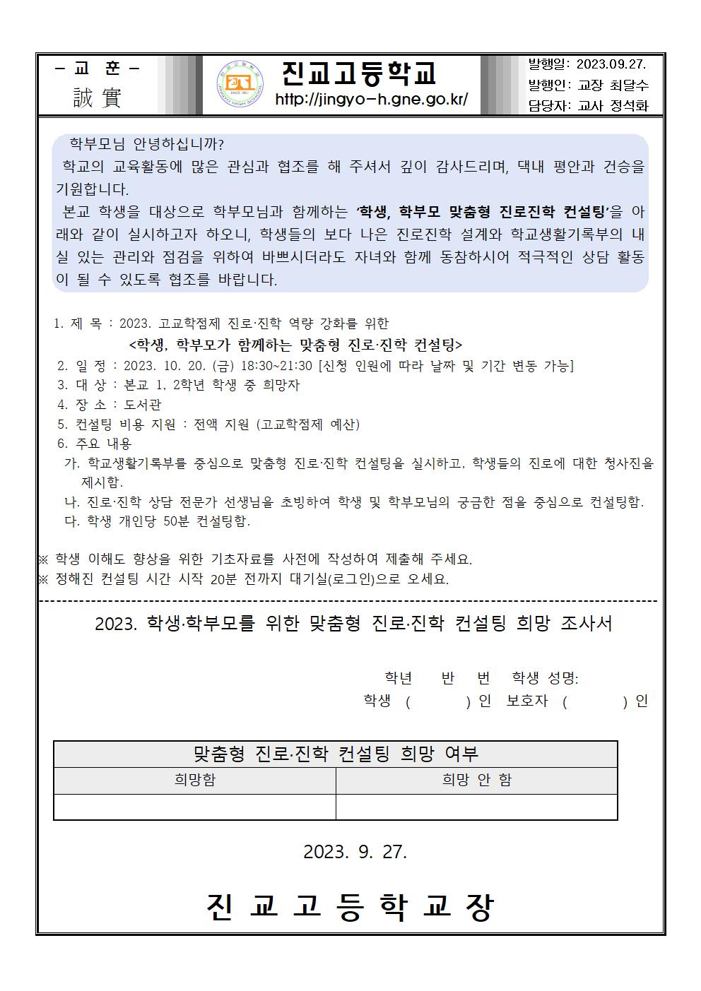 학생, 학부모가 함께하는 맞춤형 진로·진학 컨설팅 안내