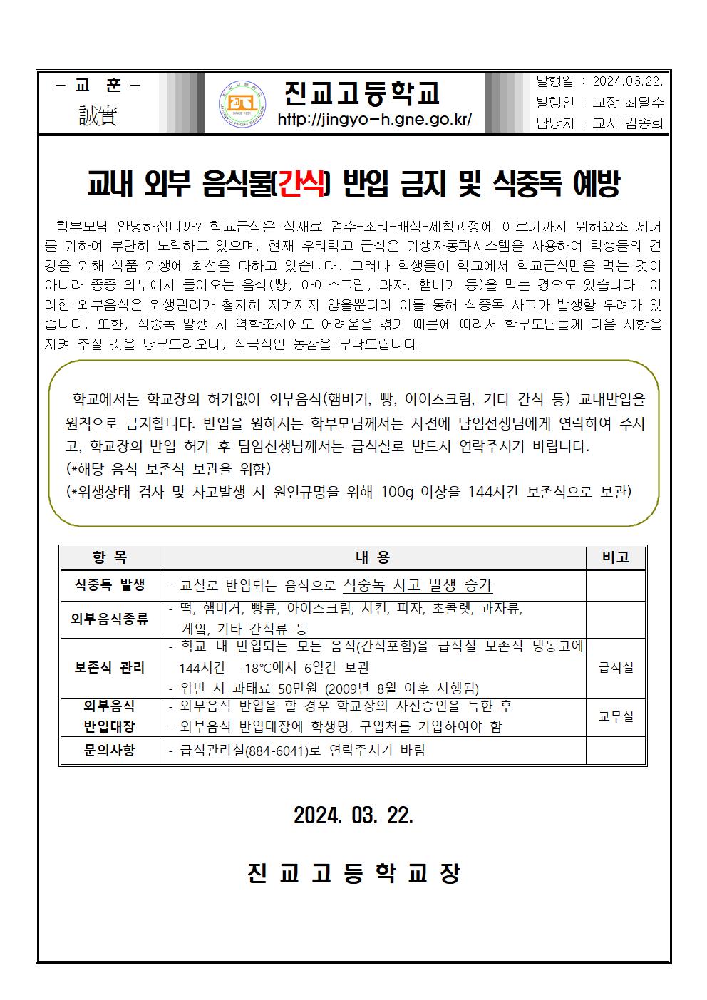 교내 외부 음식물(간식) 반입 금지 및 식중독 예방 안내
