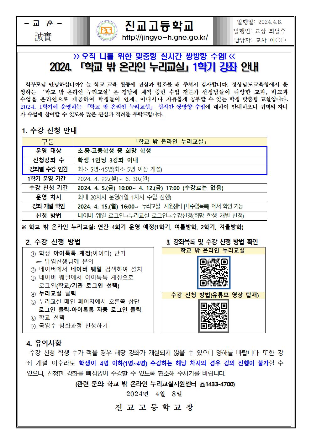 2024. 「학교 밖 온라인 누리교실」1학기 강좌 안내