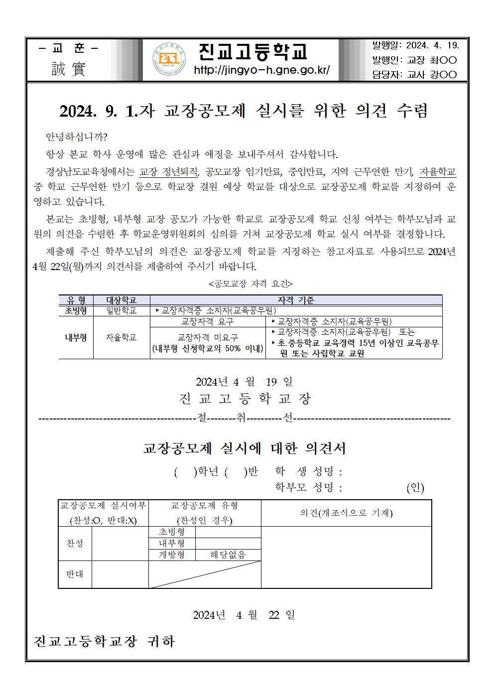 2024. 9. 1.자 교장공모제 실시를 위한 의견 수렴 안내