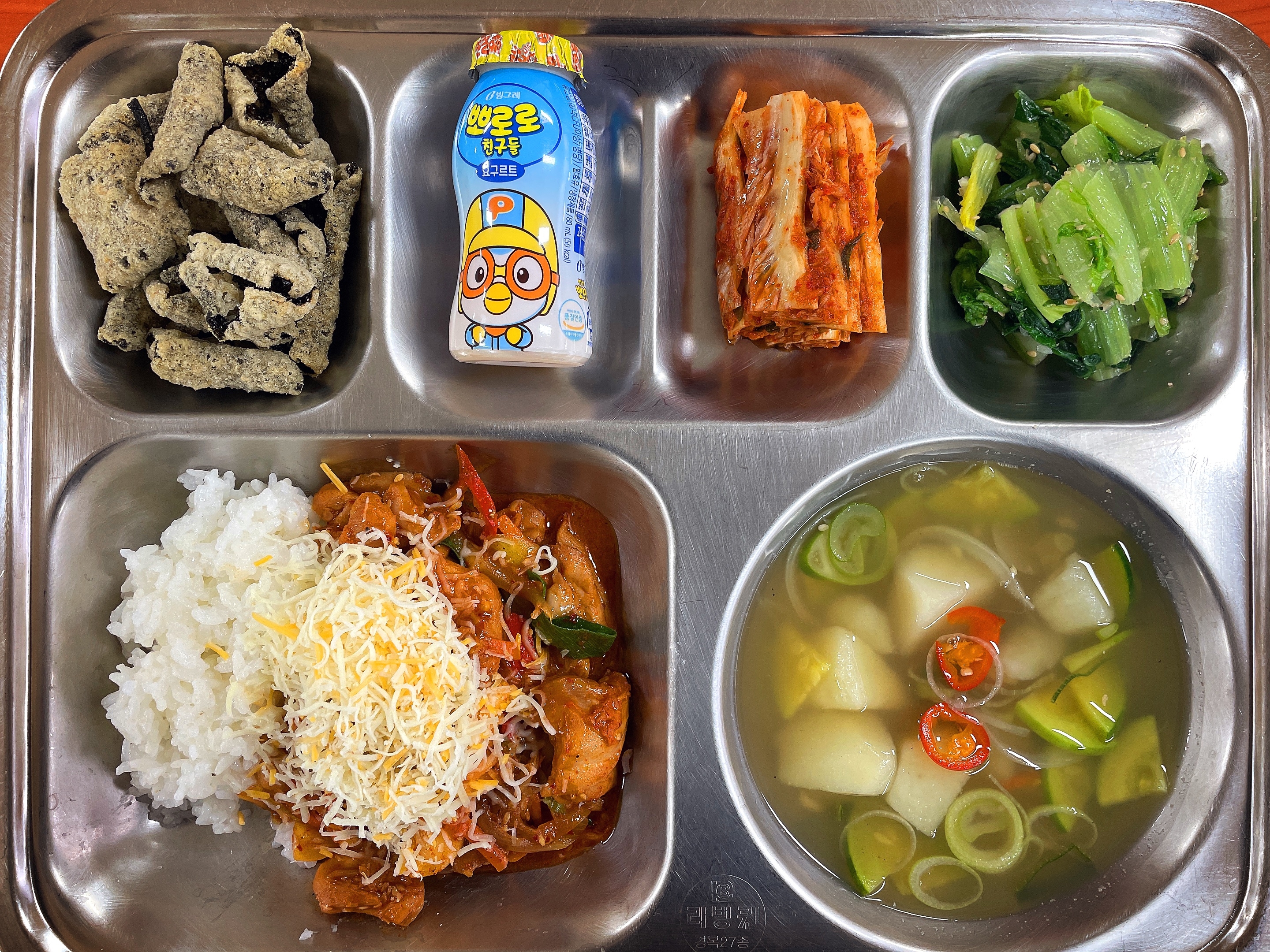 ♡눈꽃치즈닭갈비덮밥(2.5.6.12.13.15.18)감자맑은국(5.6.18)단배추나물무침찹쌀김부각(1,2,5,6)배추김치요구르트(2)837.3/46.0/615.2/3.9