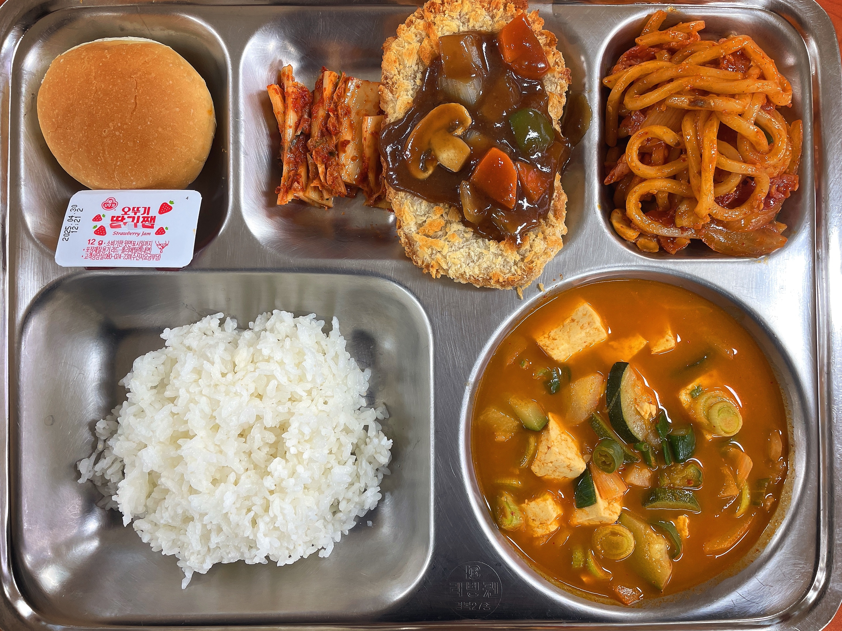 쌀밥고추장찌개(5.6)♡돈까스(1.2.5.6.10.12.13.16)♡베이컨볶음우동(1.2.5.6.10.12.13.18)모닝빵&딸기쩀(1.2.5.6.13)배추김치979.2/26.0/119.1/3.0